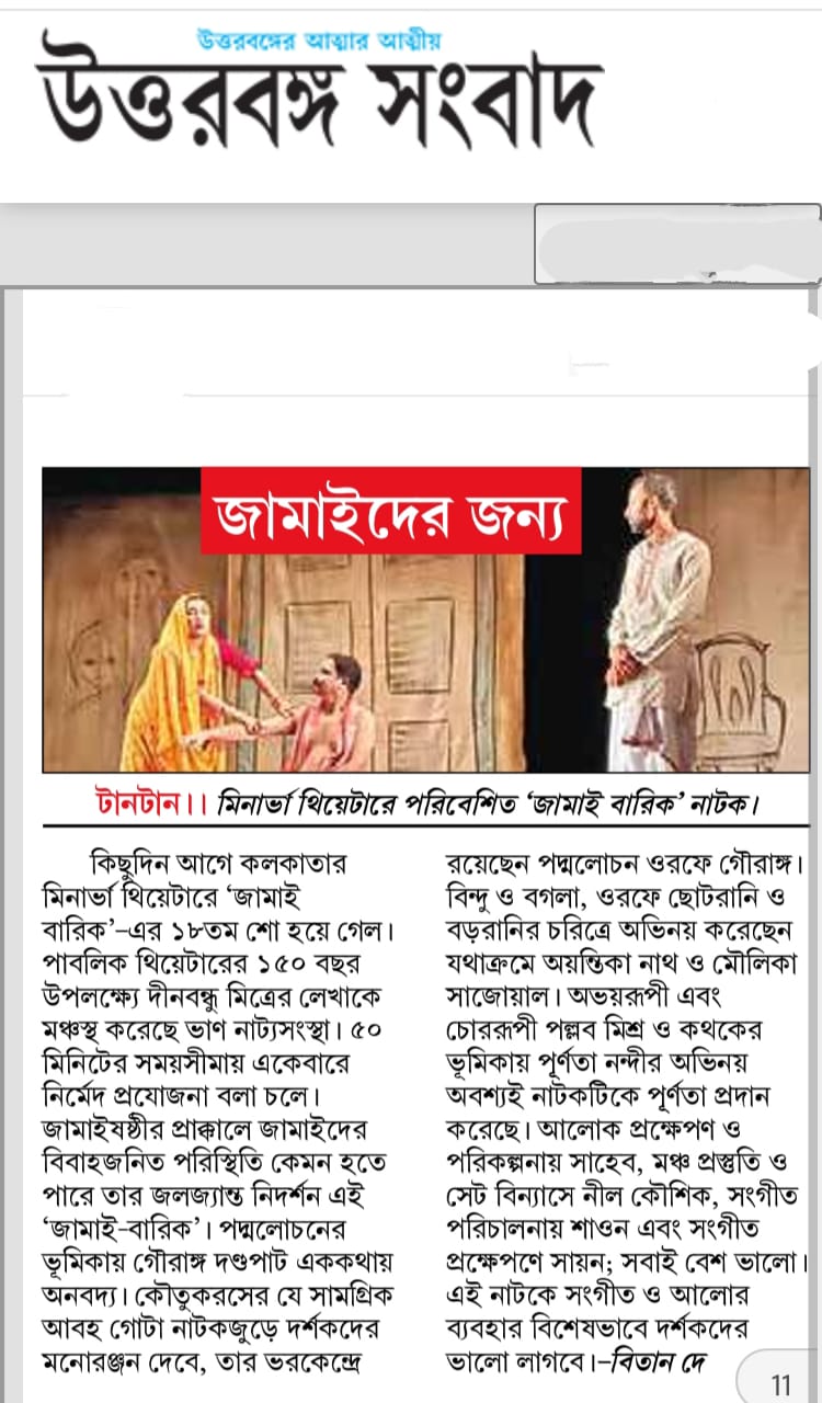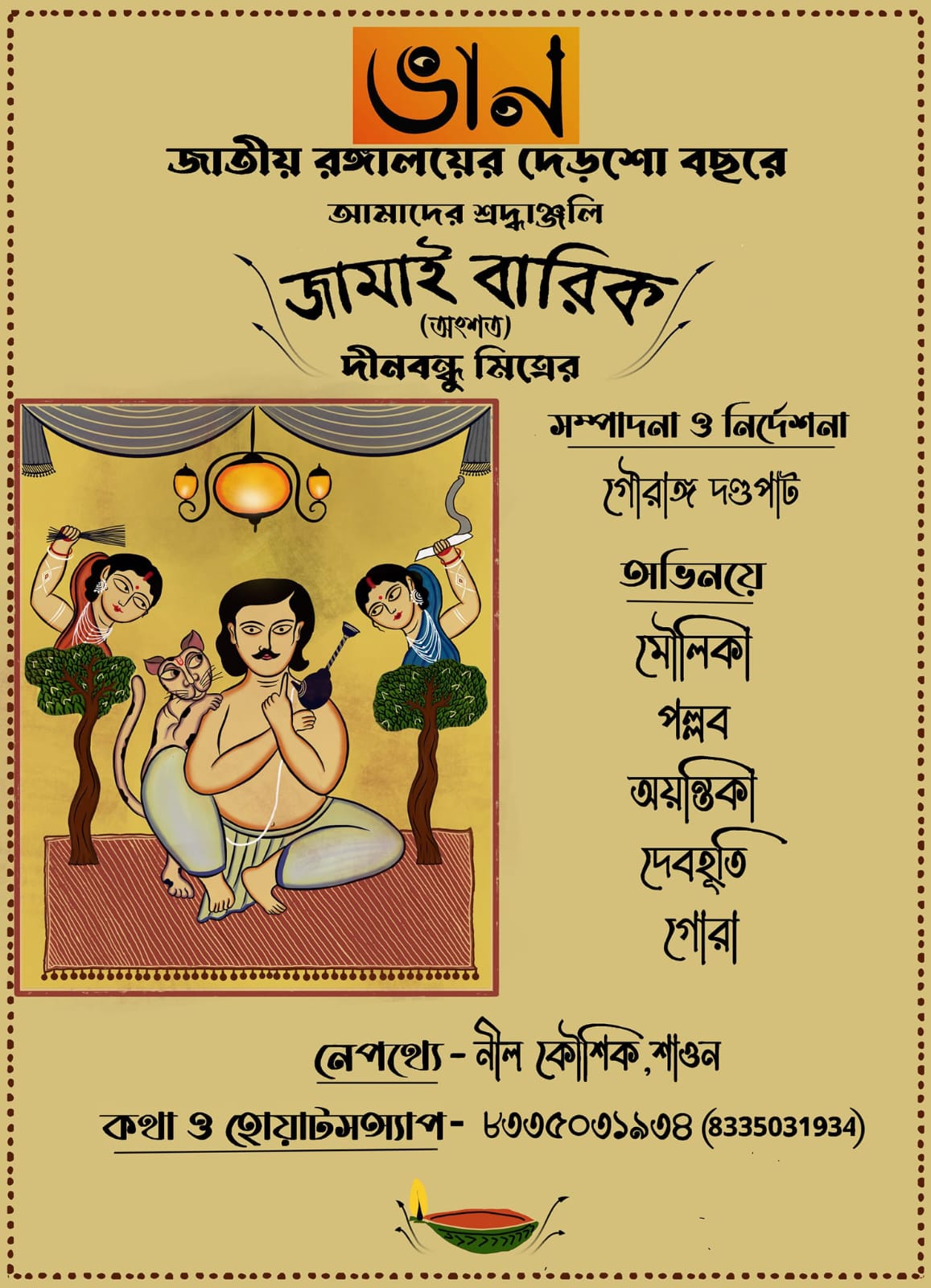 এই বছর জাতীয় রঙ্গালয় প্রতিষ্ঠার ১৫০ বছর পূর্ণ হল। বিদেশি থিয়েটারের আমোদ দেখে, বাবুদের শখের থিয়েটার পেরিয়ে অল্প কজন তরুণ বাঙালী নাট্যপ্রেমী যুবকের উদ্যোগে ১৮৭২ সালে ৭ ডিসেম্বর দীনবন্ধু মিত্রের নীল দর্পণ নাটক অভিনয়ের মধ্য দিয়ে আত্মপ্রকাশ করেছিলো ন্যাশানাল থিয়েটার। এই ইতিহাসের প্রতি শ্রদ্ধা জানিয়ে ভাণ নাট্যদল অভিনয় করতে চলেছে দীনবন্ধু মিত্রের লেখা জামাই বারিক নাটকটির একটি অঙ্ক। উনিশ শতকের ভদ্দরঘরের অন্দরমহলের হাল হাকিকত উঠে এসেছে এই নাটকে। নিখাদ মজা, রগড়,রঙতামাশা যাই বলুন না কেন দীনবন্ধু একে বলতে চায়েছেন এক ‘অপূর্ব স্থানের ইতিবৃত্ত’। অপূর্ব স্থানই বটে, ধনীবাড়ির ঘরজামাইদের ব্যারাক প্রমাণ ‘ জামাই বারিক’। সেই বারিকের বাসিন্দা অভয় কুমার তার ‘মাগ মণিবের’ রোষে পড়ে বারিকছাড়া। আর অন্যদিক দুই রমণীরত্নের স্বামী পদ্মলোচন নিজের বাড়িতেই ভাতের বদলে খান ঝাঁটা আর কিল। দেড়শো বছর পেছন ফিরে বাঙালী জীবনের এই রসময় অখ্যান ভাণ কেমন করে জীবন্ত করে তোলে সেটাই দেখার। বিভিন্ন চরিত্রে অভিনয় করছেন মৌলিকা, অয়ন্তিকা, পল্লব, গোরা ও দেবহূতি। পরিচালনায় গৌরাঙ্গ দন্ডপাট। প্রথম অভিনয় ১৮ ডিসেম্বর বিকেল ৫.৩০ এ রঙ্গকর্মী স্টুডিও থিয়েটারে। দ্বিতীয় অভিনয় ২৩ ডিসেম্বর মিনার্ভা, সন্ধ্যে ৬.৩০।